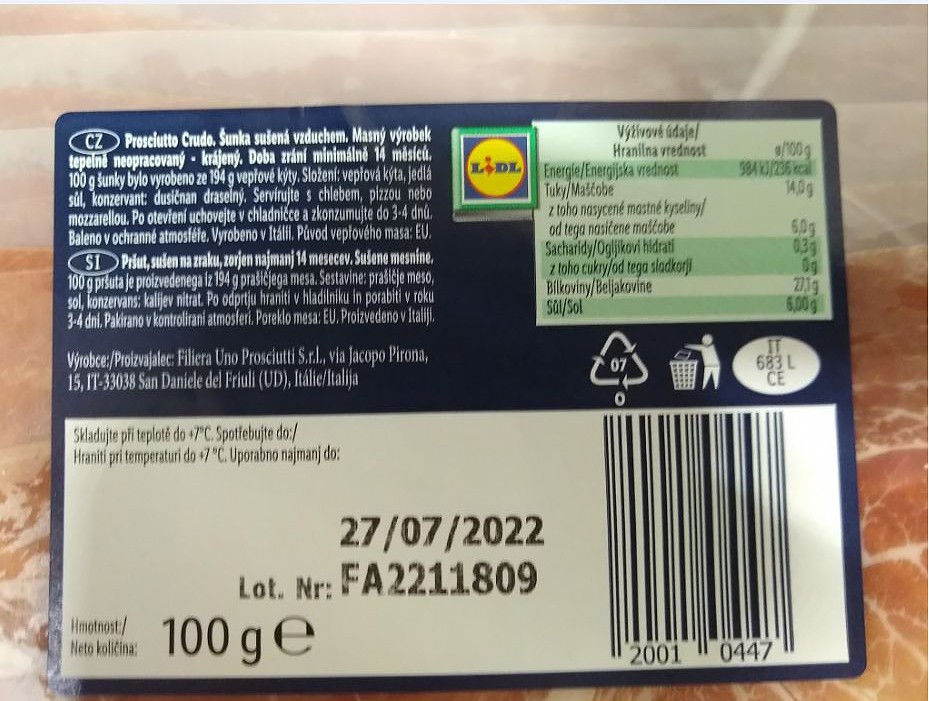 L’ispettore trova il prodotto nella catena Lidl. Ordinarono quindi immediatamente alla società di ritirarla dalla vendita. Si tratta di ITALIAMO Prosciutto Crudo con scadenza 27/07/2022, lotto: FA2211809, produttore: Filiera Uno Prosciutti Srl, via Jacopo Pirona, 15, IT-33038 San Daniele del Friuli, Italia, paese di origine: Italia.